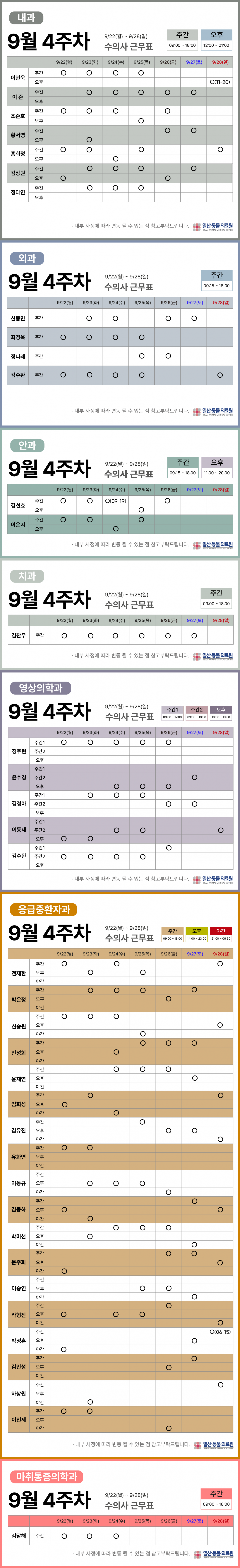 9월 4주차 수의사 근무 시간표 페이지 정보 작성자 관리자 댓글 0건 조회 184회 작성일 25-09-19 17:17 목록 본문 내부 사정에 따라 변동 될 수 있는 점 참고 부탁드립니다!